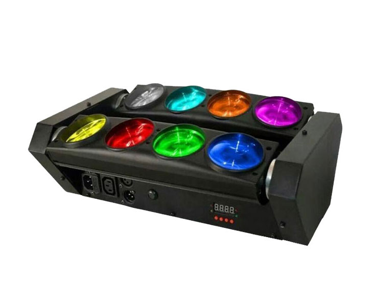 led8眼蜘蛛灯8眼光束灯酒吧效果灯 1.电压:AC100-240V,50/60HZ 2.功率:150W 3.光源:8*10W LED进口灯珠 4.颜色:白色/四合一 5.控制:DMX,主从,声控,自动模式。 6.调光:0-100% 7.显示:液晶显示屏 8.通道:6CHS/12CH 9.扫描角度:垂直180 10.发光角度:4.5度 11 .重量:5.5KG 12.外箱尺寸:395*240*180m